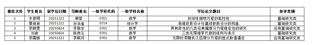 根据《东北师范大学优秀博士硕士学位论文评选办法》(东师校发字[2020]12号),经毕业生个人申请、数学与统计学院学位评定分委会遴选,推荐以下学位论文参评东北师范大学优秀博士(硕士)论文,现予公示。